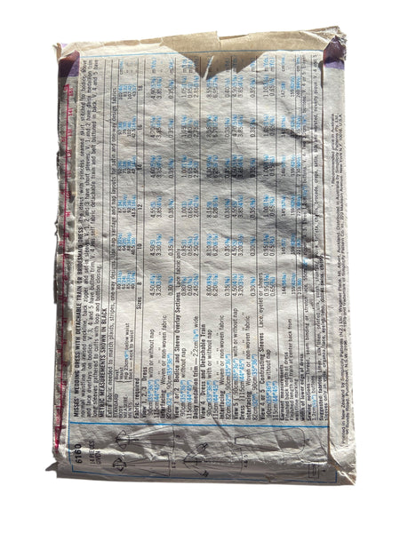 Pattern and instructions to make. Simplicity 6160; ©1973; Misses' Wedding Dress with Detachable Train or Bridesmaid Dress. The dress with princess seamed skirt stitched to bodice above normal waistline has raised neckline, back zipper and set-in sleeves. V 1, 2 & 3 have short sleeves. V 1 & 2 have daisy medallion trim and lace overlays in bodice. V 3, 4 & 5 have button trim. V 4 has self fabric detachable train and belt buttoned in back. V 4 & 5 have long sleeves gathered to cuffs with loop and button closing.