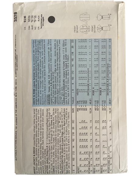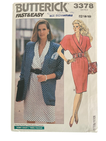 Pattern and instructions to make: Butterick 3378; ©1989; Misses' Jacket & Dress. Loose-fitting, unlined, below hip jacket has shoulder pads, pockets and long sleeves rolled-up (wrong side shows). Dress, mid-knee or below mid-kinee has shawl collar, shoulder pads, very loose-fitting, mock wrap bodice has elasticized (seamed) waist, straight skirt, back hemline slit and short sleeves. Purchased belt and hankie.