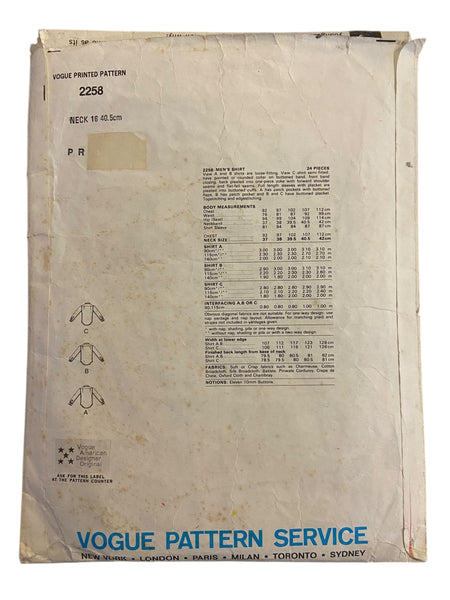 Vogue American Designer 2258; ca. 1979; Calvin Klein - Men's Shirt. View A and B shirts are loose-fitting, View C shirt semi-fitted, have pointed or rounded collar on buttoned band, front band closing, back pleated into one-piece yoke with forward shoulder seams and flat fell seams. Full length sleeves with placket are pleated into buttoned cuffs. A has patch pockets with buttoned flaps. B has patch pocket and B and C have buttoned placket. Topstitching and edgestitching.
