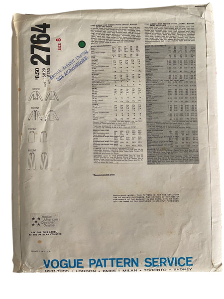 Misses’ Jacket, Blouse, Skirt and Pants: Semi-fitted, lined, front-lapped jacket has shoulder pads, side panels (no side seams), welt pockets and full length two-piece sleeves with buttoned vent. Loose-fitting blouse has two-piece upper collar, pointed under collar, front buttoned band, back gathered at neckline, full length sleeves gathered into buttoned cuffs, contrast collars, band and cuffs. Topstitching. Purchased ribbon bow. Straight, lined skirt, three inches below mid-knee length has side zipper and back hemline vent. Slightly tapered, lined pants have front pleated and back gathered into front buttoned waistband, belt carriers, mock fly zipper and side seam pockets