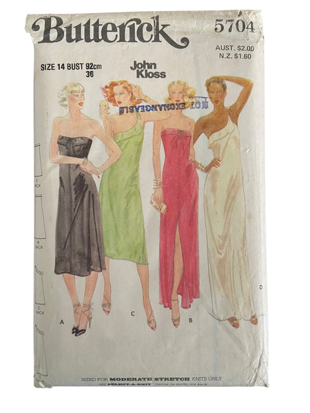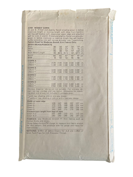 Butterick 5704; ca. 1977; John Kloss - Misses' Gown for Moderate Stretch Knit Fabrics only. A and B - Fitted and slightly flared strapless gown in below mid-knee length or evening length with deep front hemline slit has self bodice cuff, elasticized upper edge and attached self tie trim. C and D - Fitted and slightly flared one-shoulder gown in below mid-knee or evening length has self bodice ruffle extending into self narrow shoulder ties. Topstitching.
