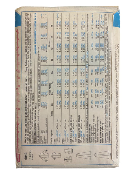 Simplicity 6843; ©1975; Junior Petites' and Misses' Unlined Shirt-Jacket and Pants ... Young Contemporary Fashion: The top-stitched shirt-jacket with long or short set-in sleeves has front button closing, shirt type collar and pleated pockets with buttoned flaps. The lower pockets have optional loops with "D" ring trims. The upper pockets are optional. The long sleeves are pleated to buttoned cuffs. The short sleeves have back detail. The pants with fly front zipper have waistband. The skirt with back zipper has waistband.