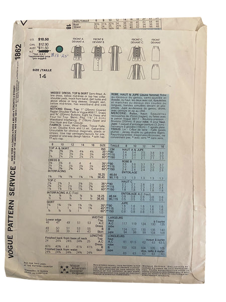 Vogue American Designer 1862; ©1987; Albert Nipon - Misses' Dress, Top & Skirt. Semi-fitted A-line dress, below mid-knee or top has collar, shoulder pads, mock front band, dart tucks and above elbow or long sleeves. Straight skirt, below mid-knee, has waistband and side zipper.
