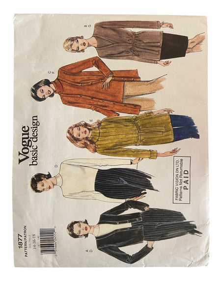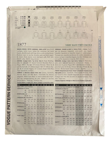 Vintage 1990s, Vogue 1877 misses/misses petite cardigan, tunic and top. Semi-fitted cardigan, below waist, below hip variations, has mock bands, shoulder pads and long sleeves with stitched hems. Pullover tunic or top has shoulder pads and back zipper. E. Below elbow sleeves with fold back cuffs.B, E: belt. D, E, F: collar. D, F, G: long sleeves.