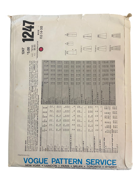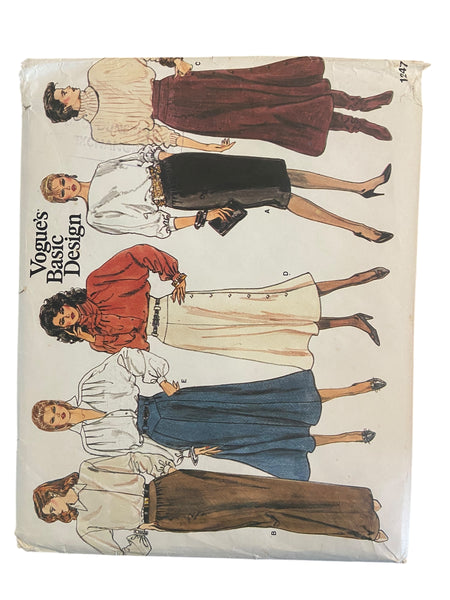 Pattern and instructions to make All have waistbands, lined yoked and back zippers, A and B: Straight skirt, 2" below mid-knee or evening length, has side pockets. B: back vent. C and D: mock, side-buttoned closing. C, D and E: lower calf length. C and D: right side pocket. C and E: flared. D: slightly flared. D and E: carriers, shaped waistband. E: gored and side pockets.