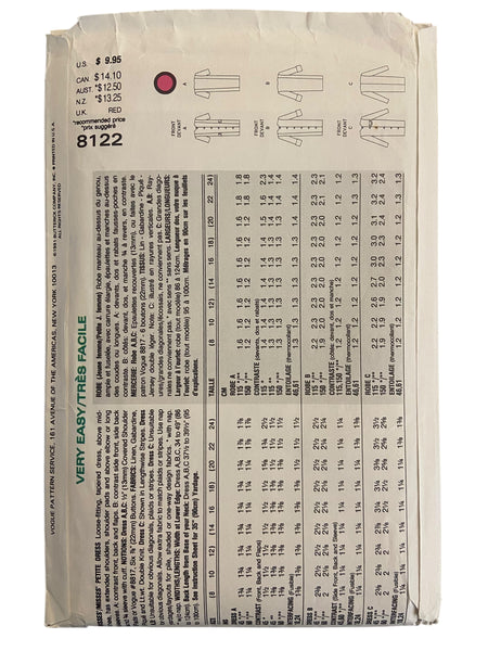 Vogue Easy Options 8122 vintage 1990s dress sewing pattern. Bust 36, 38, 40 inches